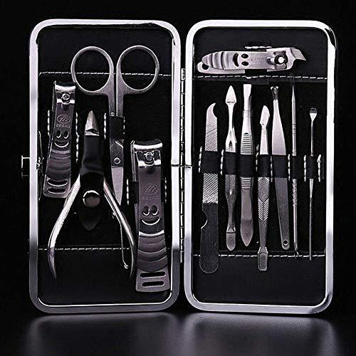 Set includes: Tweezers, cuticle clipper, eyebrow scissor, 3x nail clippers (small, large & bevel one), nail file, ear pick, V shape cuticle pusher, U shape cuticle pusher, pealing knife & pealing fork