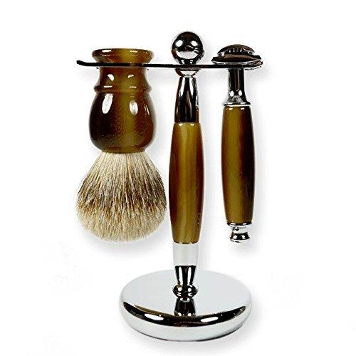 - 3 Piece Kaliandee Shaving Set with Silvertip Brush in Horn, Fiore Razor, and Horn & Chrome Stand