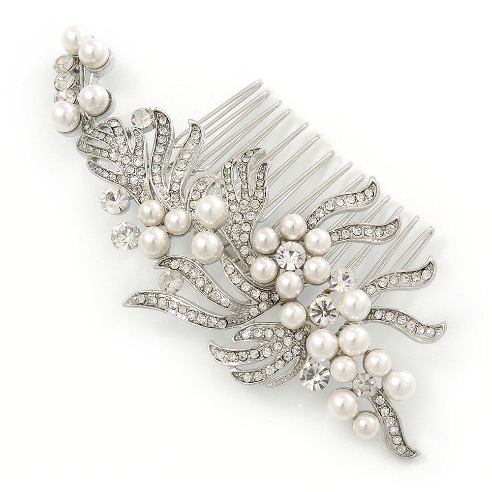 Want picture-perfect hair? Slip this beaut comb into the back of your ponytail or use it to hold your hair away from your face. Featuring a large side hair comb, crafted in rhodium plated metal and decorated with a floral motif. The flowers made of white glass pearls, the leaves with clear Austrian crystals. The comb measures 105mm across and is approximately 50mm long. Sparkle away no matter the occasion! This product does not contain any natural pearls.